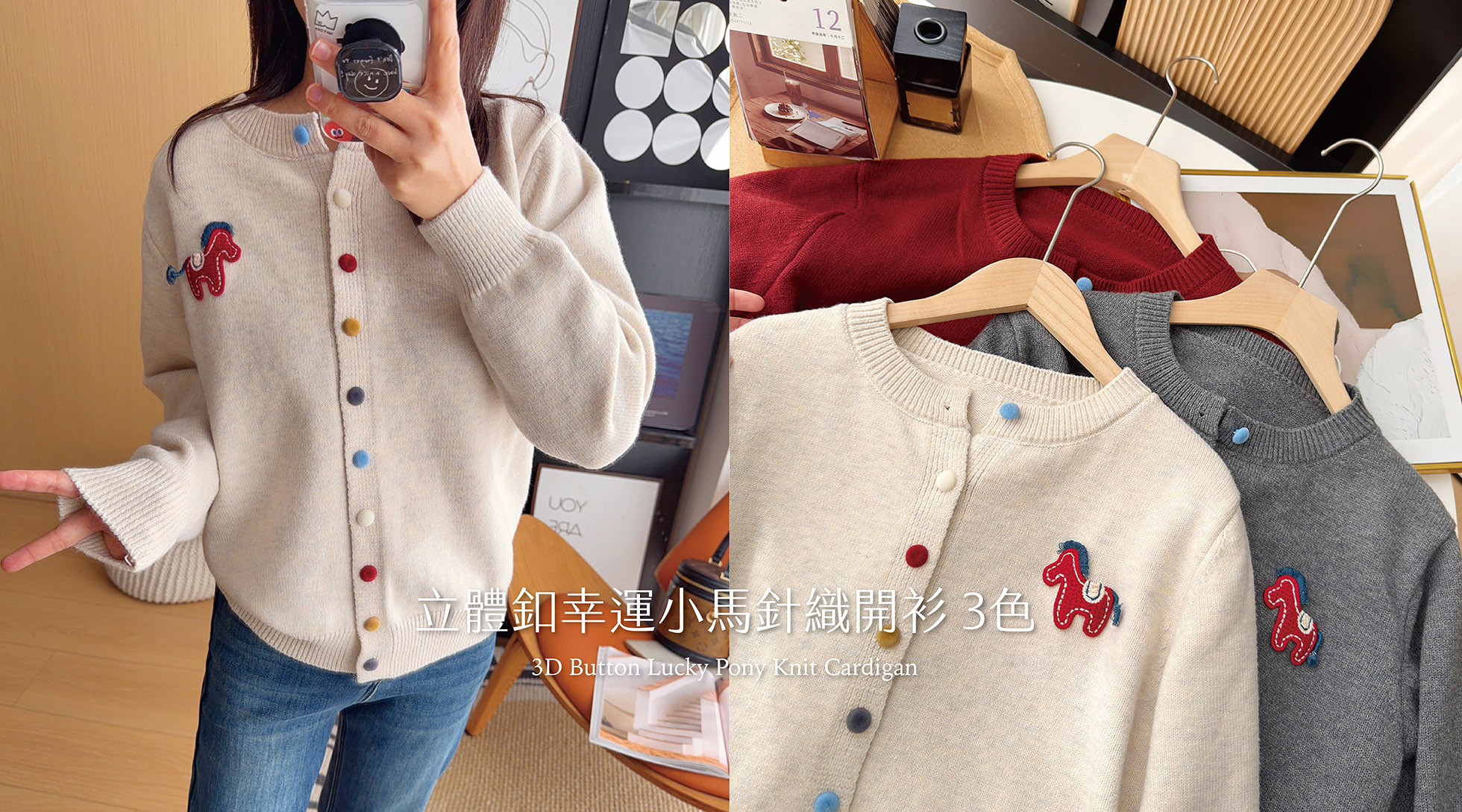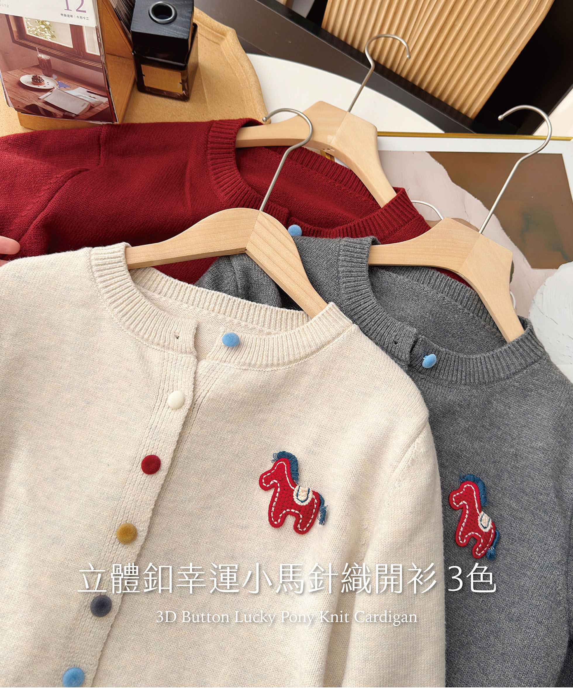 立體釦幸運小馬針織開衫 3色
